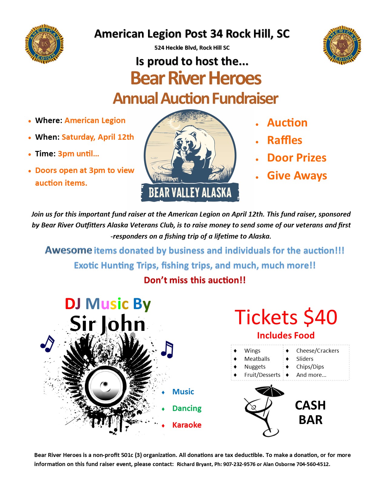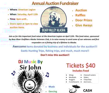 Each year Bear River Heroes holds a fundraising event at the American Legion in Rock Hill, South Carolina. The fundraiser consists of a life auction, raffles, music, and of course food and drink. This year (2025) the Bear River Heroes fundraiser will be held on April 12th. This event is critical to our fundraising effort, and we invite you come and join us for an evening of fun. If you can't make it to our event, please contact us for information about how to donate to this program.